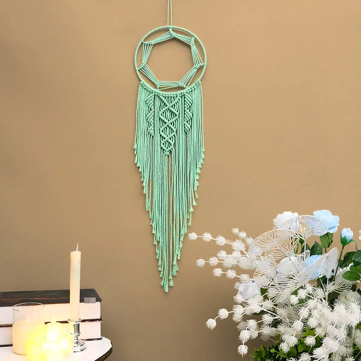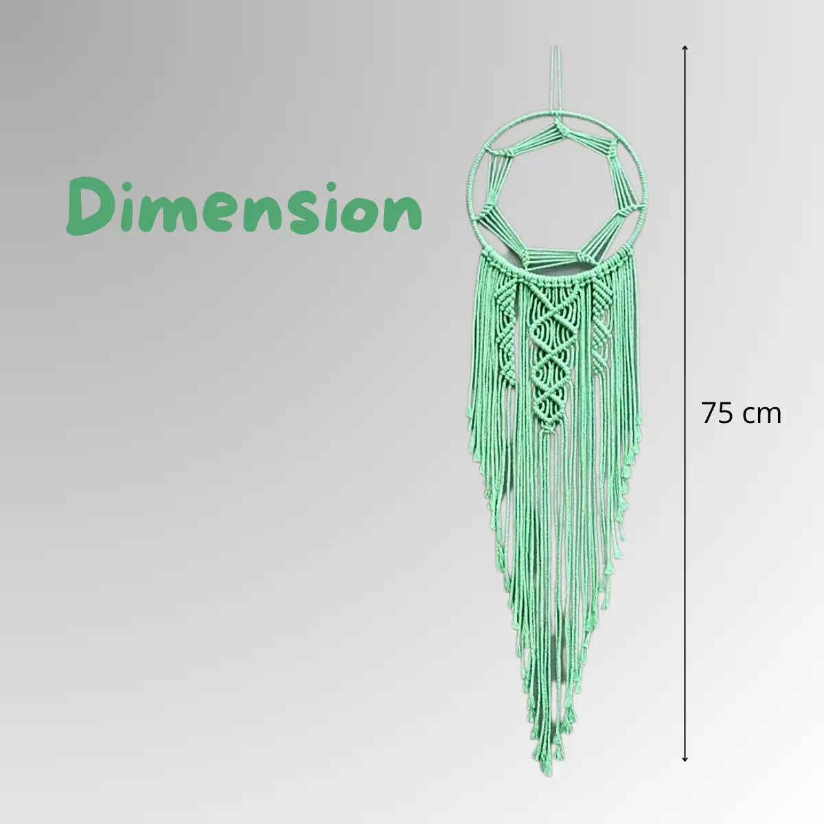 Transformez votre intérieur avec l’attrape-rêve macramé vert d’eau, un chef-d’œuvre enchanteur qui évoque l’harmonie et la sérénité. Ce magnifique attrape-rêve, tissé avec soin, incarne un esprit mystique et sacré, apportant une énergie apaisante et protectrice à votre espace de vie.