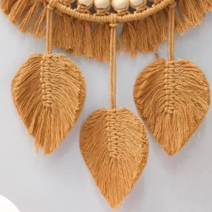 Entre ces deux cercles, des perles blanches enveloppées de macramé rouille créent une texture raffinée et une profondeur visuelle. Pour rendre cette pièce encore plus parfaite, trois plumes en macramé de la même teinte sont suspendues en bas, ajoutant une touche bohème et élégante.