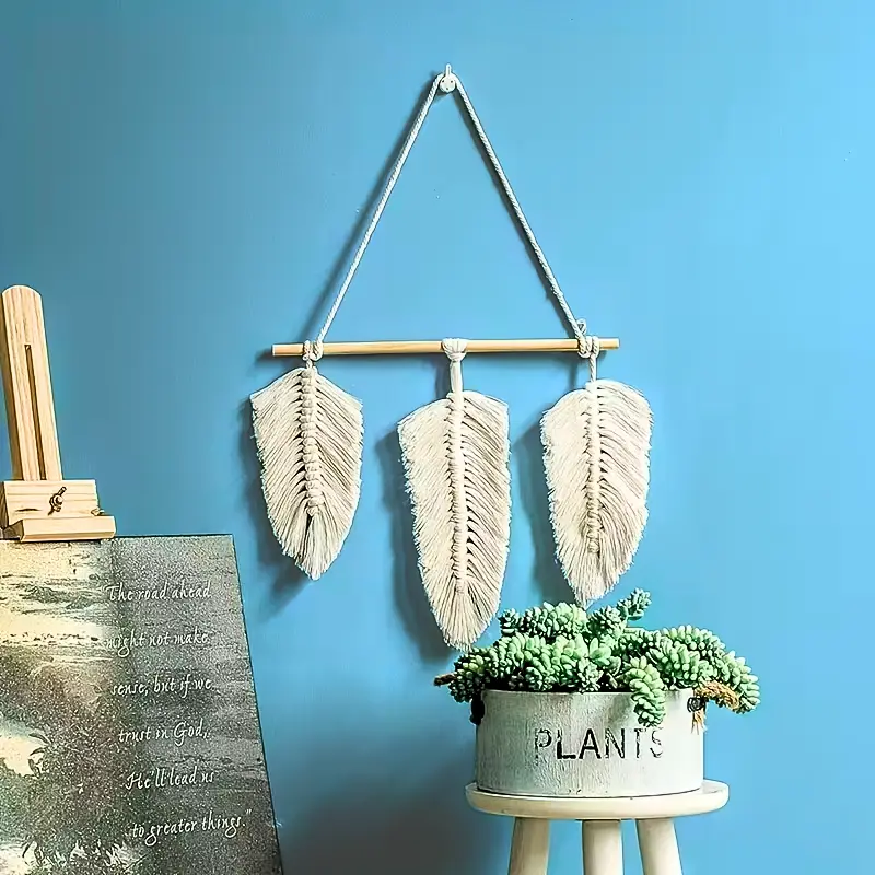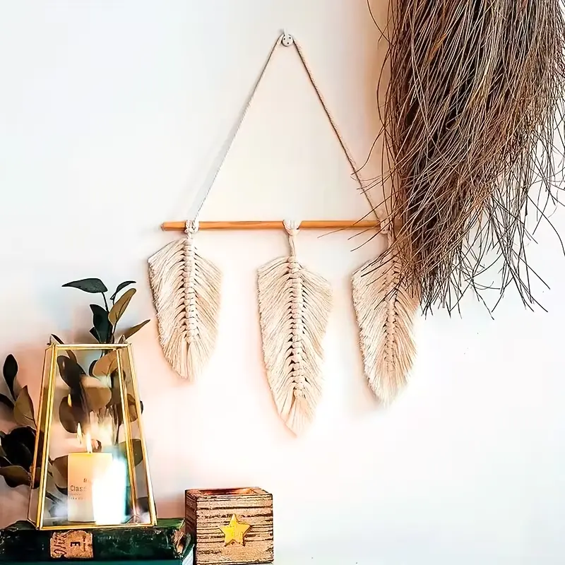 🧵 Laissez-vous séduire par la Plume Géante Murale en Macramé Blanc, une pièce artisanale délicate qui incarne la simplicité et la beauté naturelle du macramé. Suspendue à un bâton en bois de 30 cm, cette œuvre est composée de trois grandes plumes indiennes soigneusement tissées à la main. Chaque plume est attachée avec des nœuds d’alouette, un détail typique du macramé qui renforce l’authenticité et le charme de cette décoration murale.