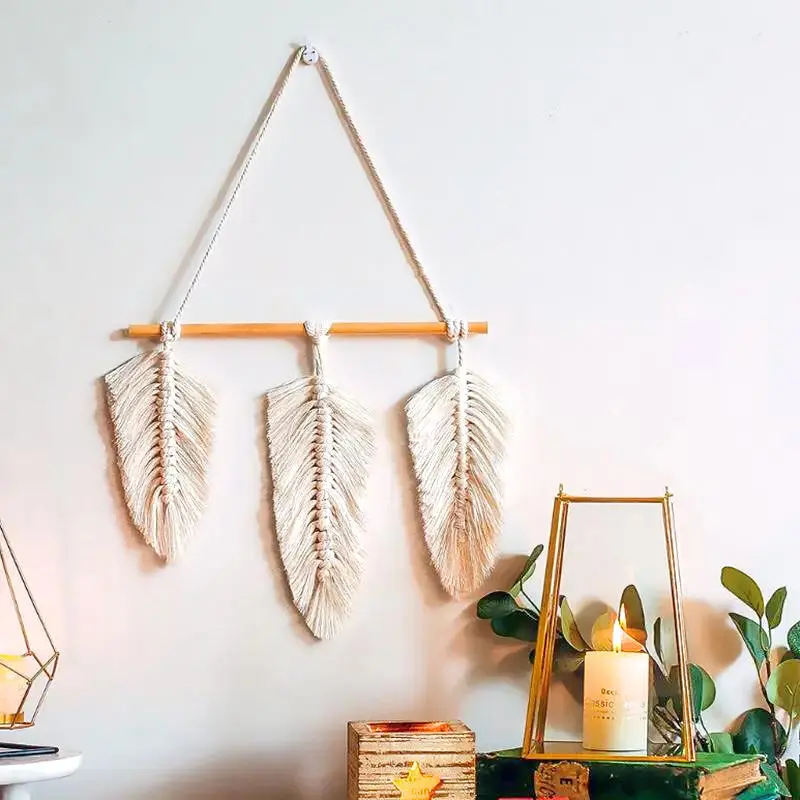 - 1 Plume Géante Murale en Macramé Blanc avec un bâton en bois de 30 cm