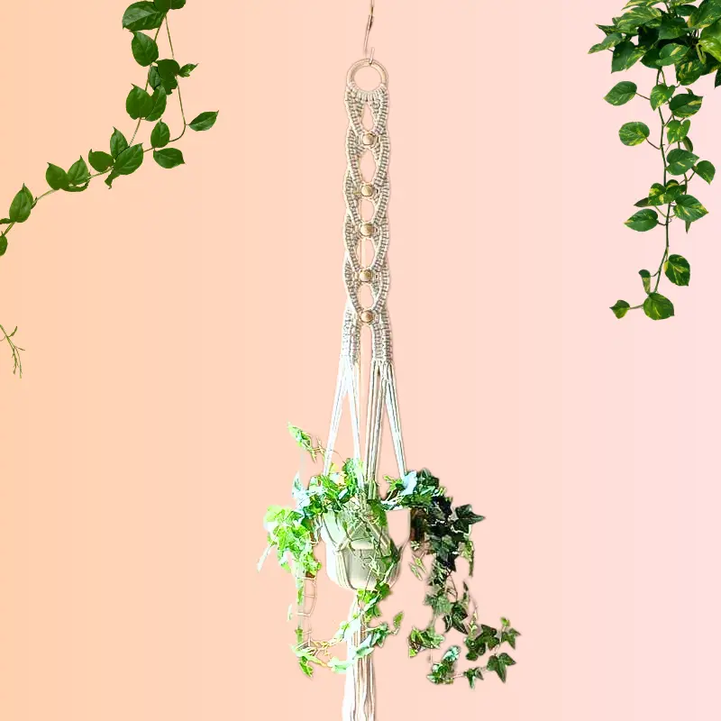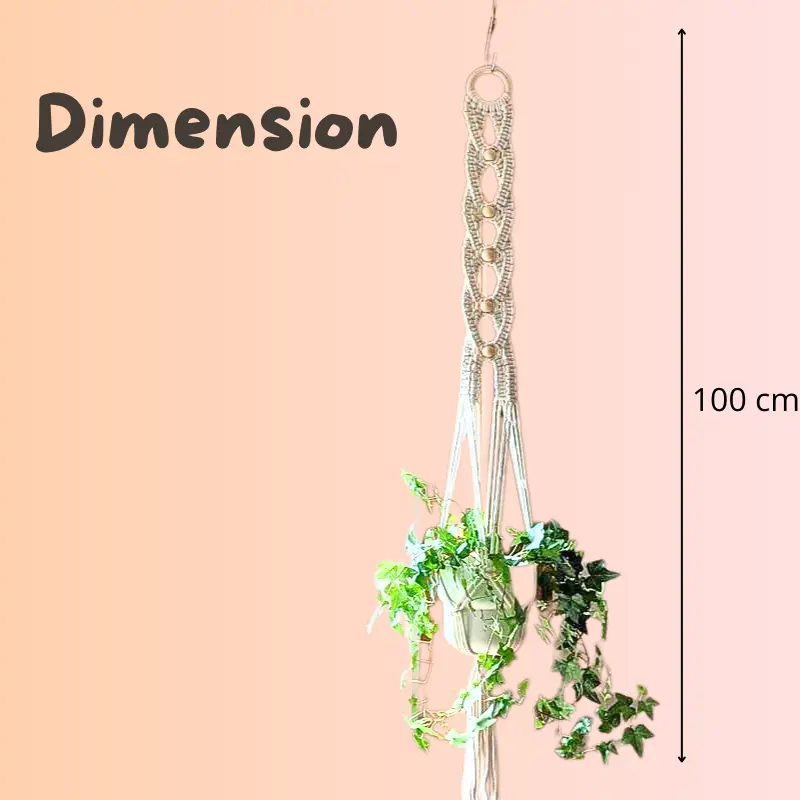 Cette suspension est fabriquée à la main en coton blanc, créant un filet résistant et raffiné pour accueillir vos pots de fleurs. Les nœuds complexes et les cinq perles en bois clair ajoutent une touche d’authenticité et de charme rustique.
