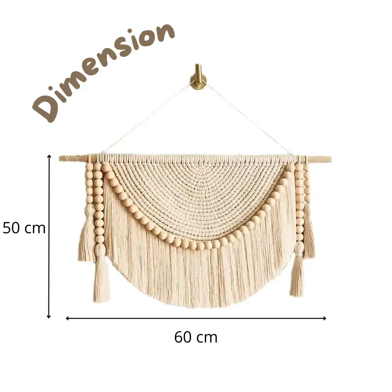 🧵 Apportez une ambiance chaleureuse et moderne à votre intérieur avec cette superbe tenture murale en macramé. Confectionnée à la main à partir de cordes 100 % coton, cette pièce se distingue par ses perles délicates et ses franges élégantes. Un demi-cercle est aussi formé par des centaines de nœuds formant un tapis totalement symétrique.
