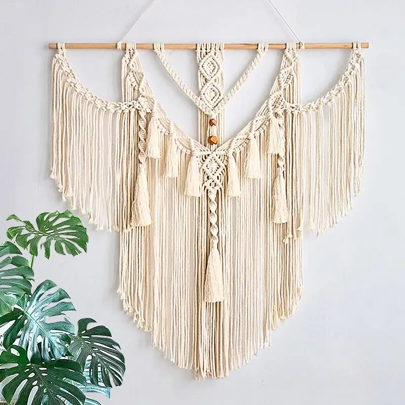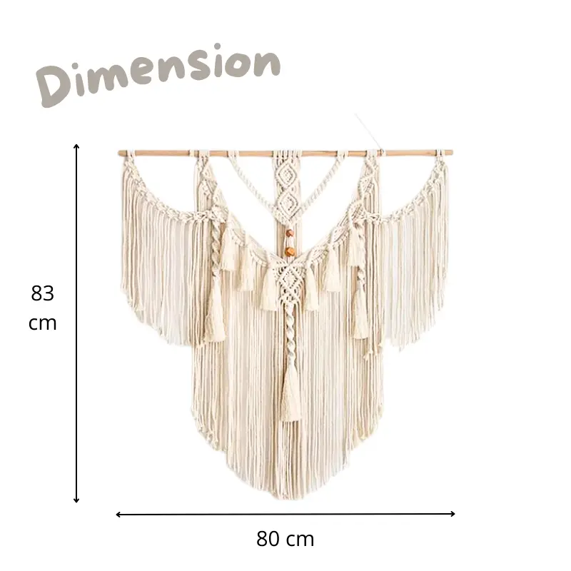 🧵 C’est la plus belle pièce de notre collection de tête de lit en macramé, avec notamment son ornement de joyaux en bois et ses franges indiennes. Cette pièce exceptionnelle, composée de trois sections, est une petite merveille de notre collection. Au centre, une grande frange se déploie, accompagnée d’un tapis de nœuds plats entrecroisés et d’un élégant joyau en bois marron en son milieu. Les deux autres franges, partant des extrémités de l’accroche en bois, rejoignent la frange principale, formant une silhouette semblable à des ailes.