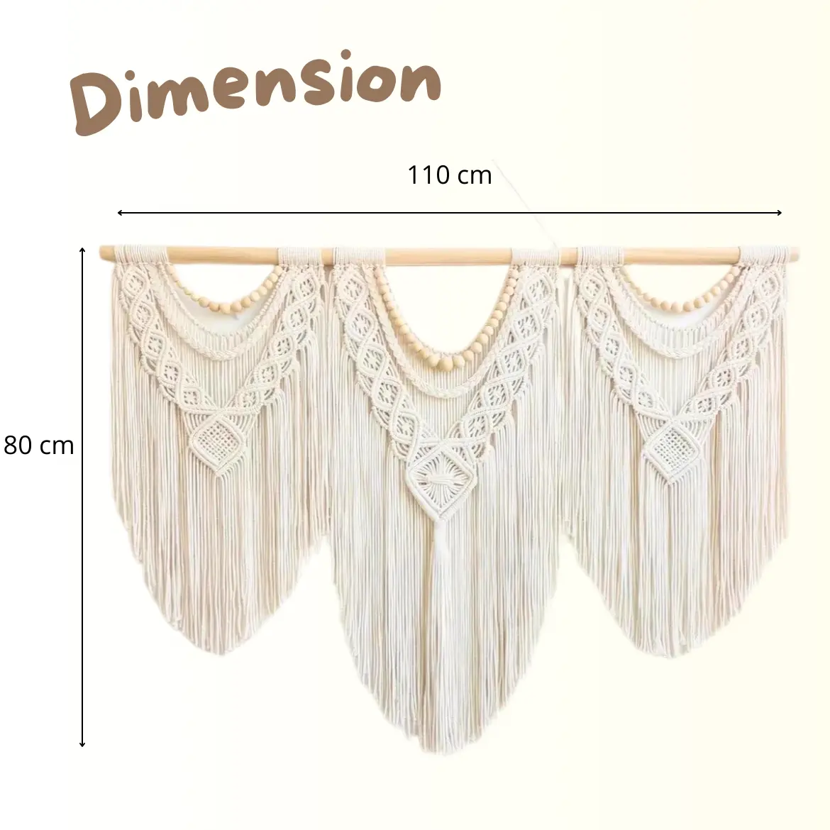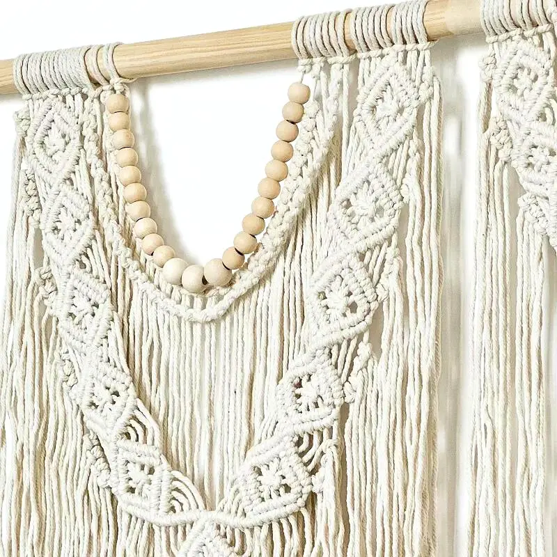 🌙 La tête de lit présente trois magnifiques guirlandes tressées avec des nœuds complexes, ajoutant une texture riche et apaisante à votre décor. Trois guirlandes de perles en bois beige embellissent encore plus l’ensemble, offrant une touche naturelle et élégante.